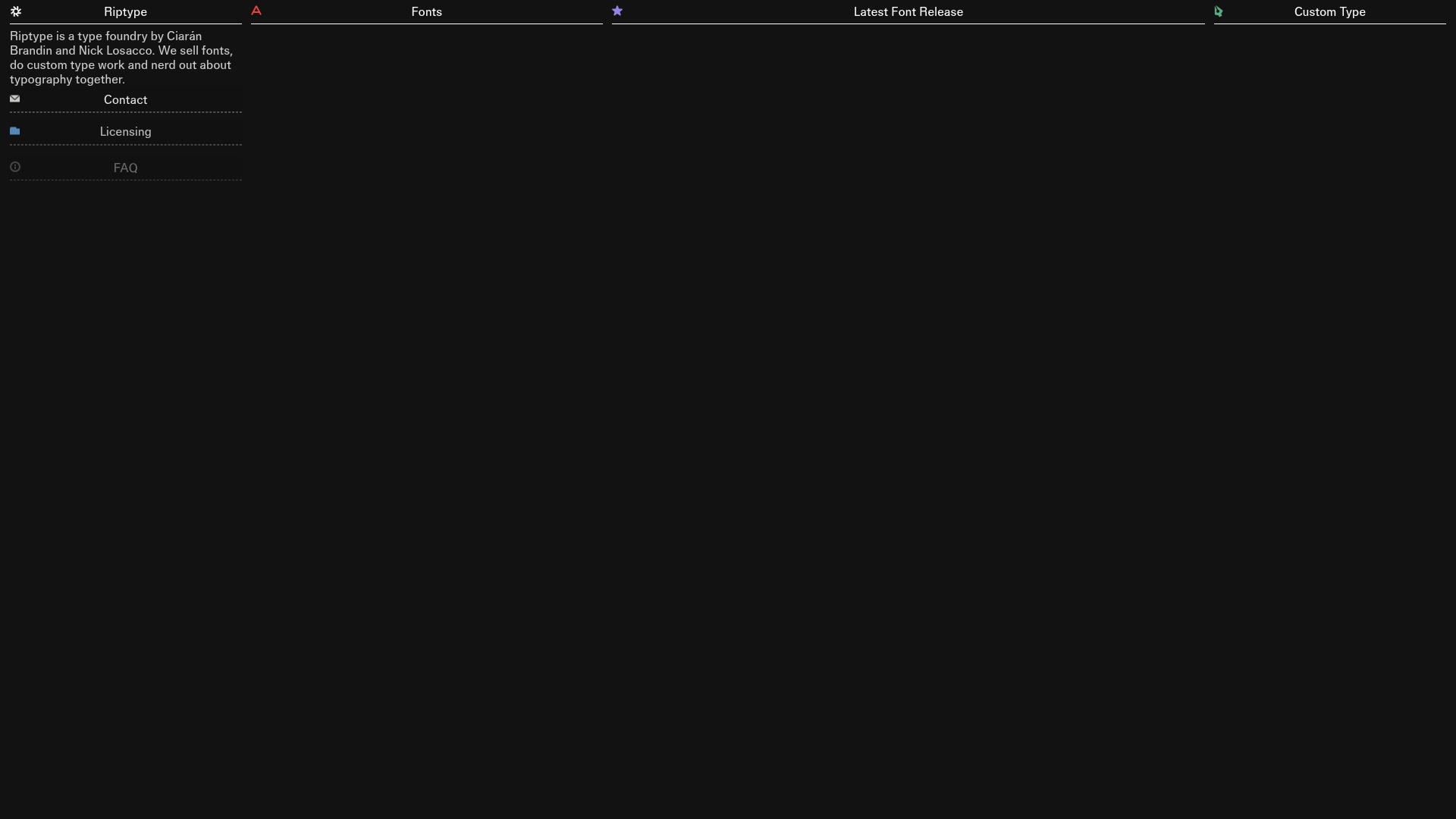 Riptype is a type foundry portfolio featuring a sophisticated four-column bento grid layout set against a deep black background. It is a strong reference for clones because of its high-density information architecture that uses vertical accordion drawers to manage content without leaving the single-page view.