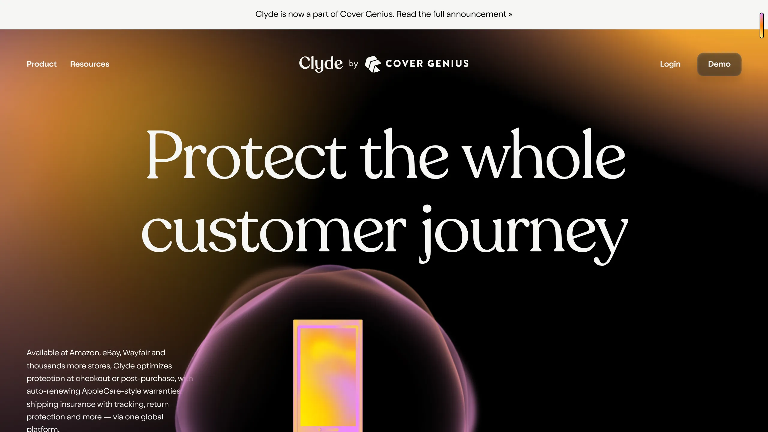 This is a high-end, dark-themed landing page for Clyde, an insurance and warranty platform. It is an exceptional clone reference because it successfully blends a minimalist layout with sophisticated motion design, such as animated gradient backgrounds and scrolling image mosaics, to create a premium "enterprise-tech" feel.