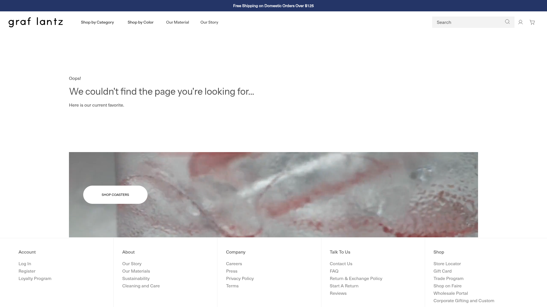 This 404 error page from Graf Lantz demonstrates how to maintain brand authority and drive conversions even on missing pages. It replaces the standard dead-end with a sophisticated minimalist layout featuring a high-impact video hero and a complete e-commerce navigation framework. It is a strong reference for creators looking to turn technical errors into discovery opportunities through curated "favorites" and a robust footer architecture.