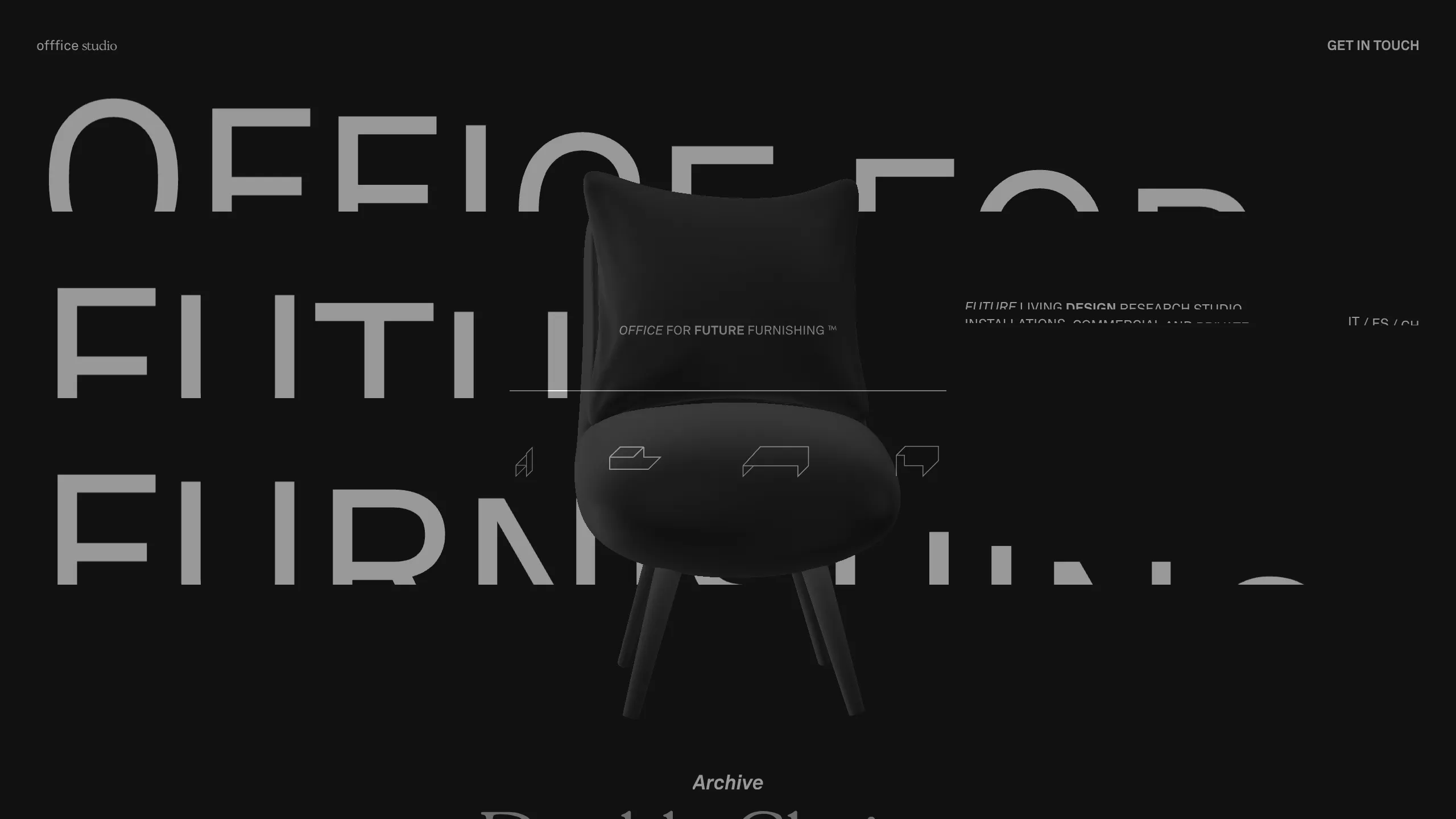 OFFFICE FOR FUTURE FURNISHING) and a specialized serif/italic font (marked by classfont-gs) for brand accents and buttons like "Archive". Text sizes range from massive15vwhero units to functionaltext-xsutility links. - Page Structure & Flow: The layout follows a linear vertical flow: a bold responsive hero section with integrated 3D models, followed by a centered "Archive" list section, and concluding with a multidisciplinary bio and contact information section.