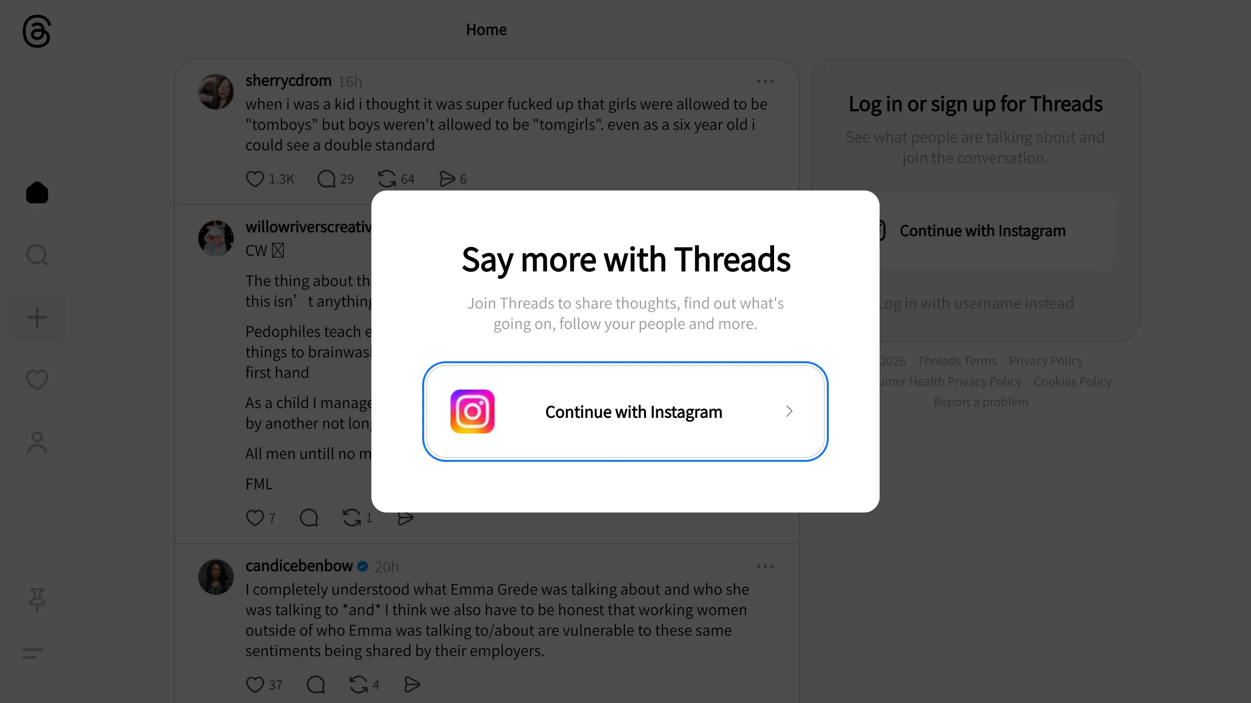 Threads is Meta's text-centric social network, featuring a streamlined, content-first layout that prioritizes readability and conversion. It is a premier reference for cloning a modern social feed due to its sophisticated use of white space, subtle interaction states, and a highly refined authentication flow integrated directly over the live content.