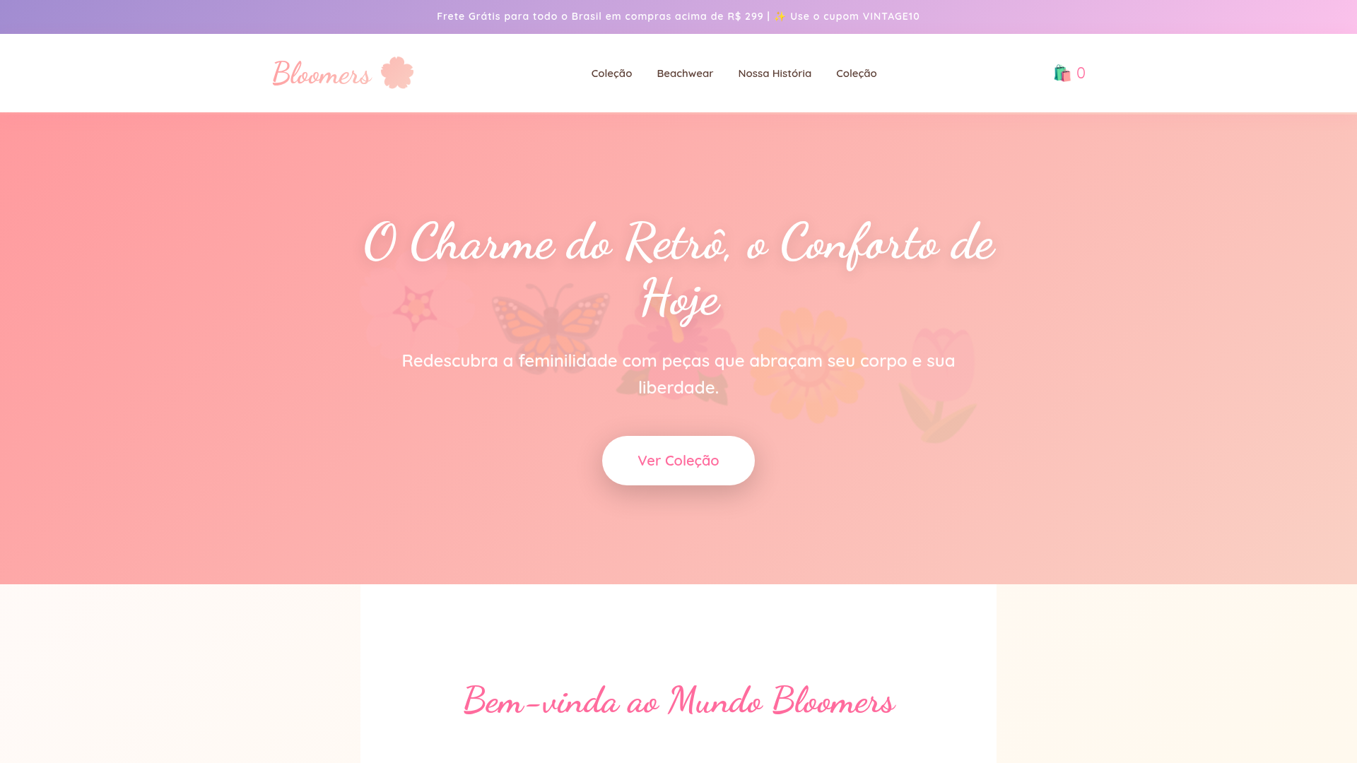 - Page Structure & Flow: The layout follows a classic vertical funnel: promotional top bar → emotive hero section with CTA → brand narrative ("Bem-vinda ao Mundo Bloomers") → product highlights grid → icon-based value propositions (Features Bar) → authority/trust links.