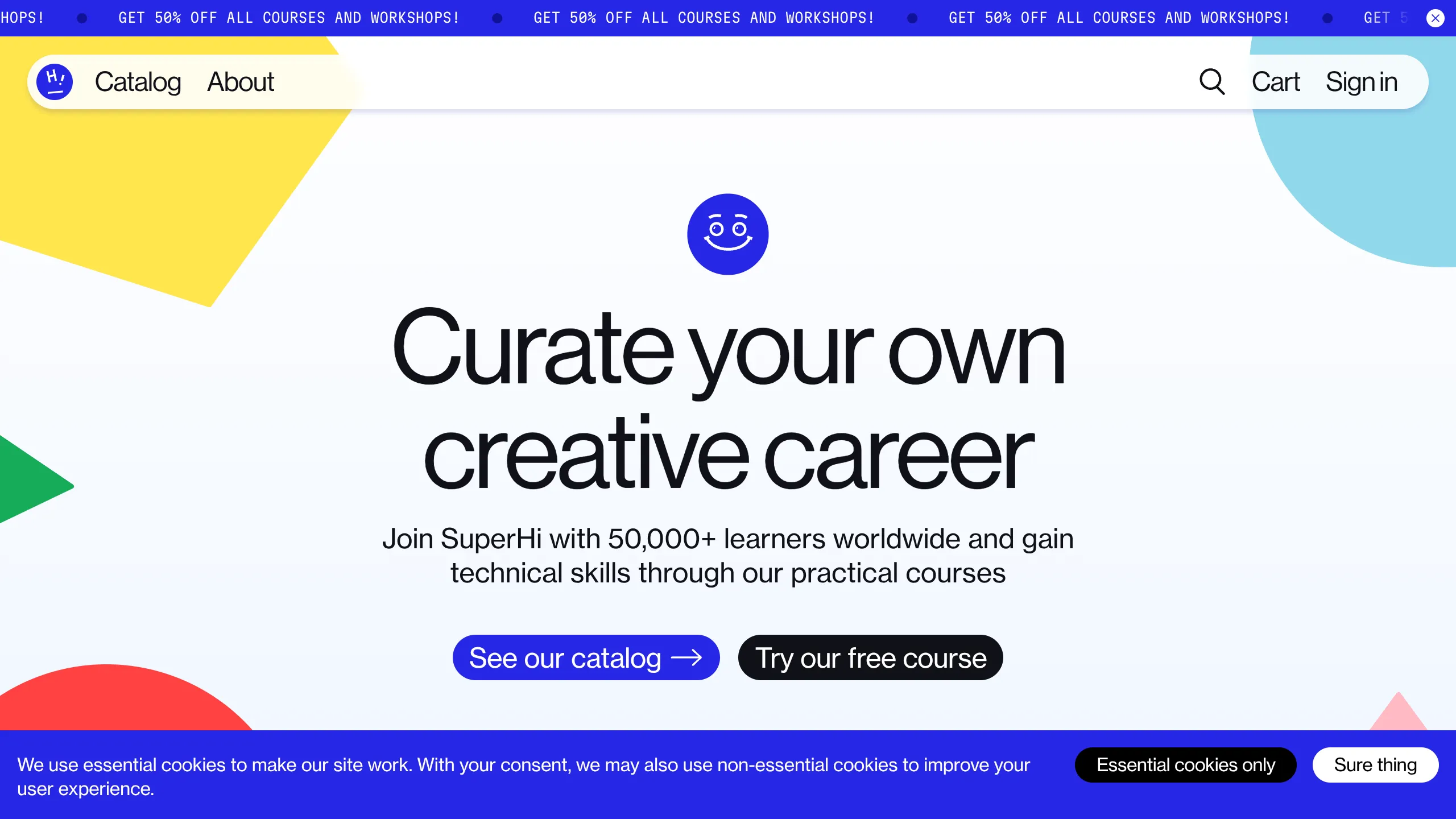 SuperHi's landing page is an exemplary model of high-energy, modern educational branding that balances playful geometric abstraction with a clear conversion focus. It is a strong remix reference for developers looking to build a professional yet approachable presence that utilizes floating UI elements and a bold primary color palette.