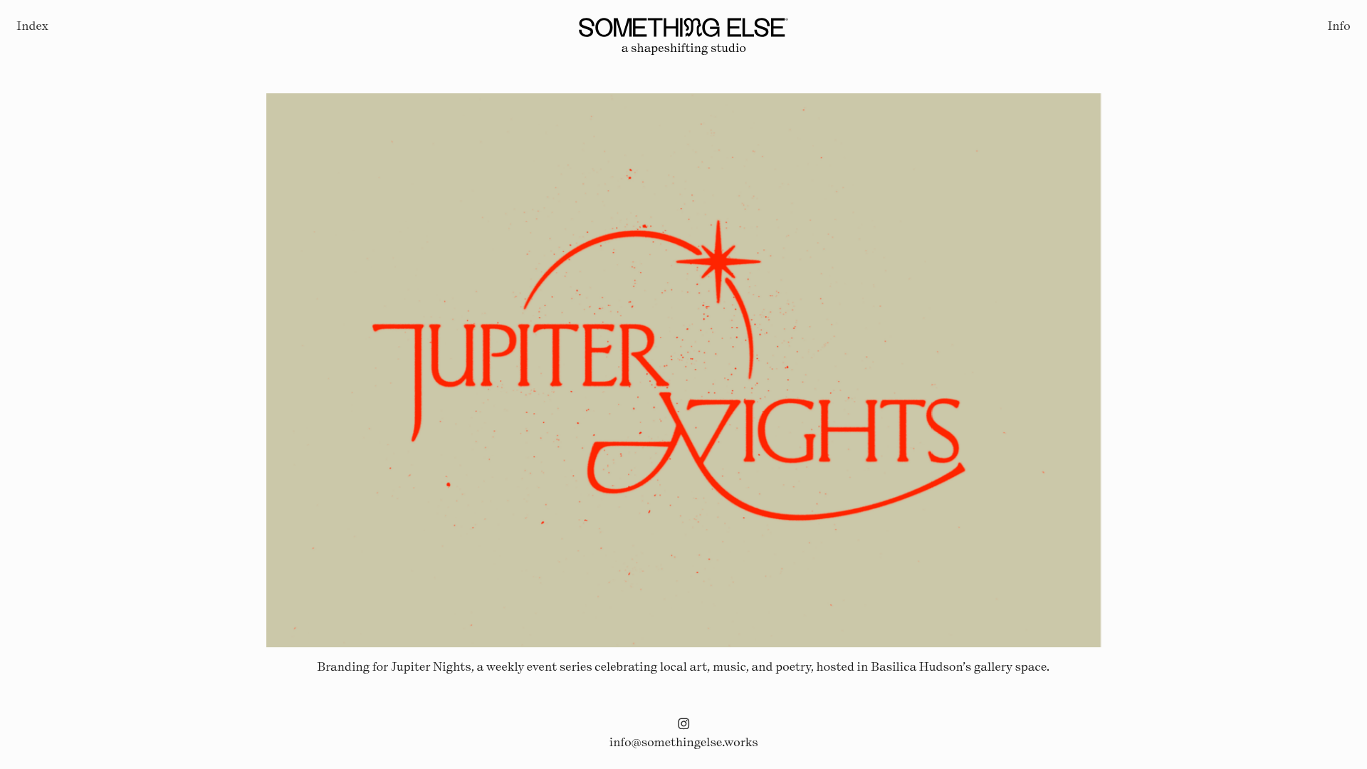 - Color Palette & Visual Hierarchy: The site uses a neutral, slightly off-white background that allows the vibrant project content—like the bright orange "Jupiter Nights" logo—to command attention. The visual hierarchy is extremely flat, with the project media being the primary focal point, followed by centered secondary text.