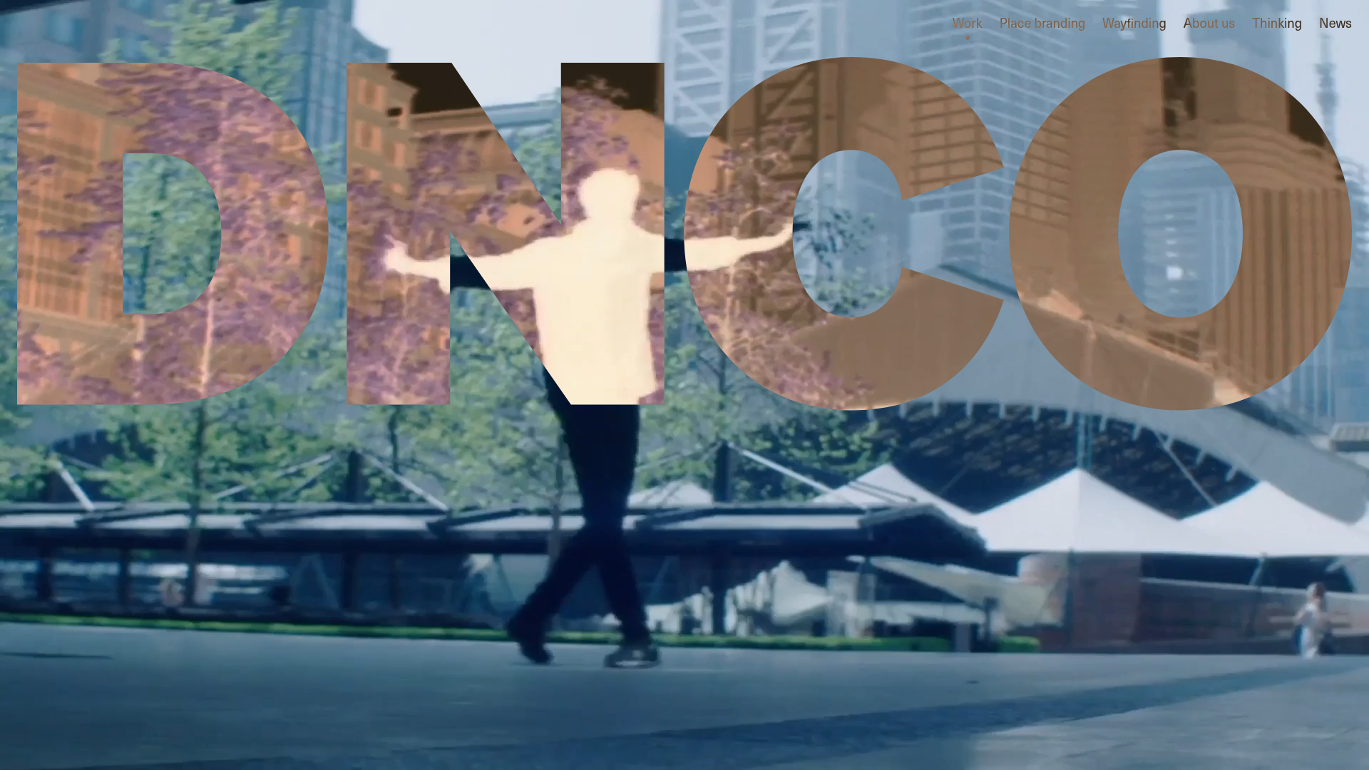leading-none), while subheaders and body text maintain a minimalist aesthetic. The DNCO logo and primary headings occupy significant negative space to emphasize scale. - Page Structure: The layout follows a linear narrative: a full-height cinematic hero section, a large-text mission statement, a structured filtering menu, and finally an dense grid of project tiles.