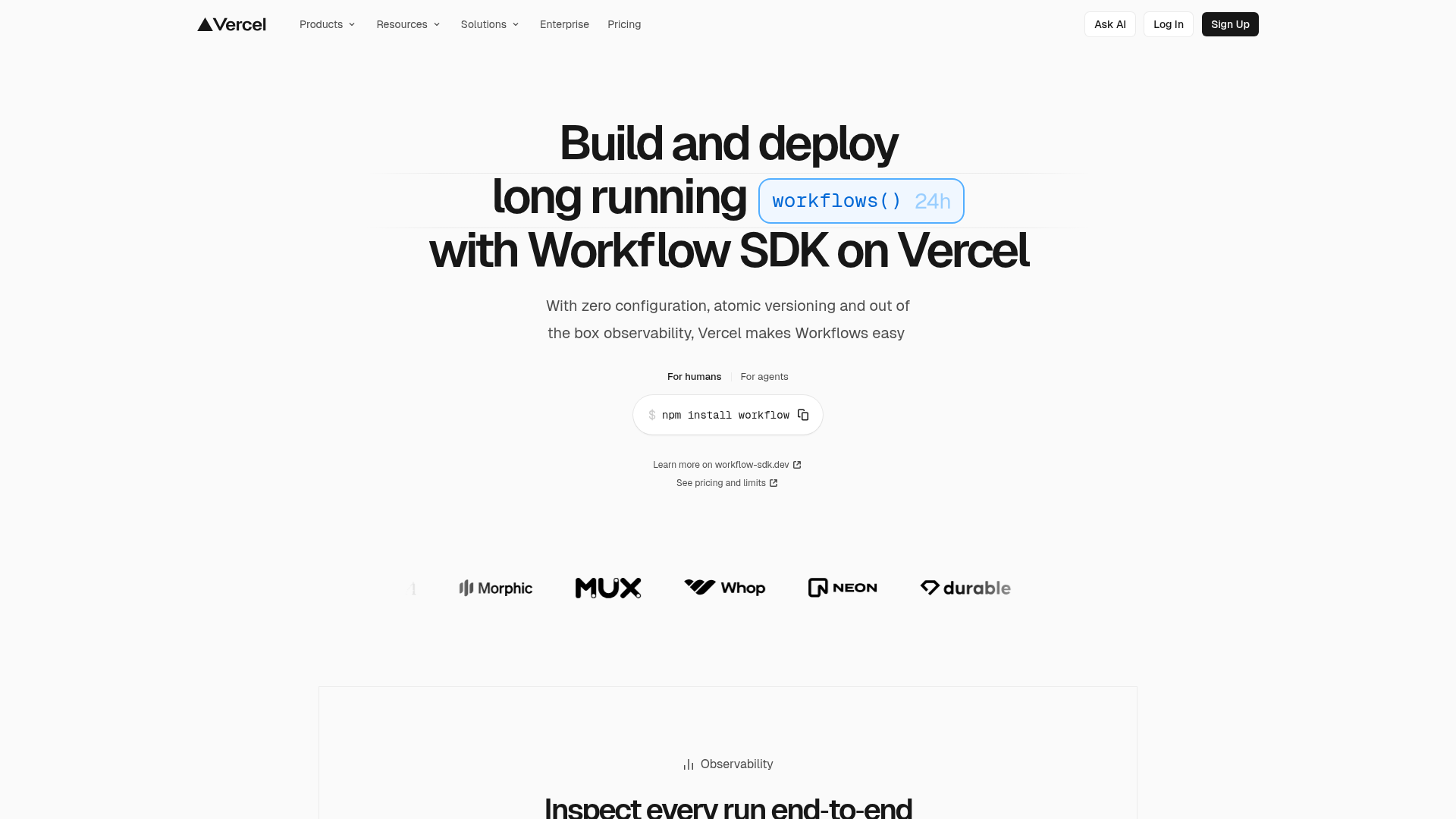 This landing page is a high-performance developer marketing template designed by Vercel to launch the Workflow SDK. It is an excellent reference for cloning because it masters the balance between minimal aesthetics and high-density technical information, utilizing a sophisticated typographic system and clean component architecture.