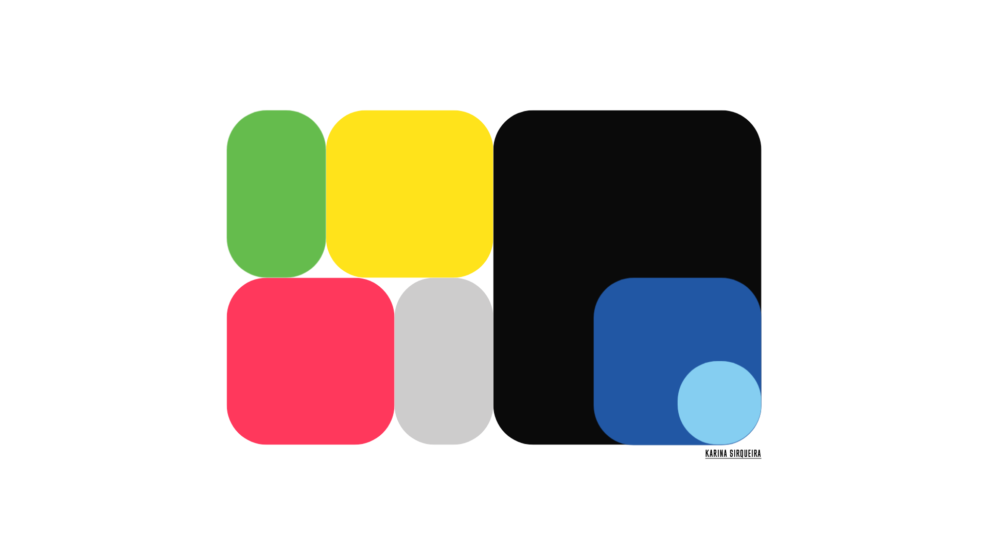 - Typography: The typography is extremely restrained, featuring a clean, condensed sans-serif (seen in the name "KARINA SIRQUEIRA"). The scale is small relative to the graphic elements, emphasizing the brand's visual identity over verbal descriptions.