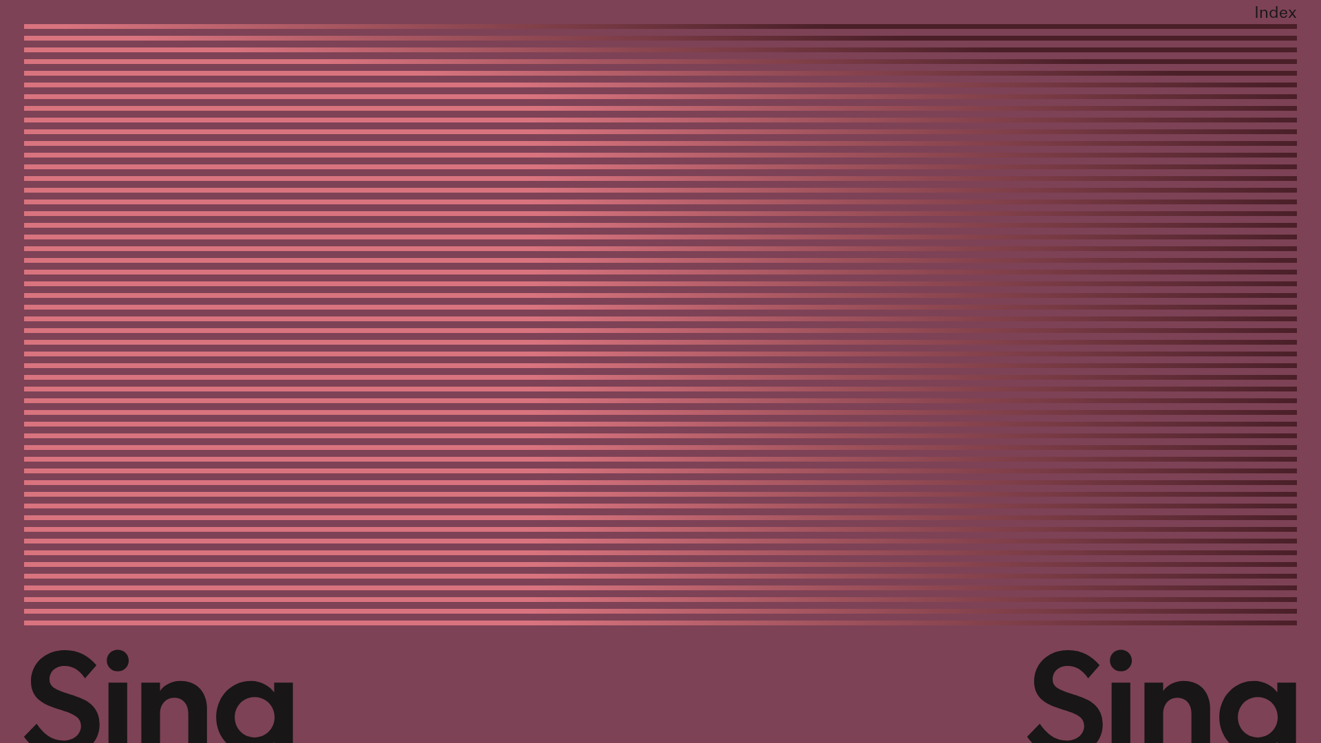 #7D4C56approx.) contrasted with deep charcoal or black text. The hierarchy is driven by extreme scale—oversized "Sing" headers at the bottom anchors the hero, while the line-grid occupies the majority of the visual weight. - Typography System: The design utilizes a clean, geometric sans-serif (similar to ITC Avant Garde or Futura). Scale is the primary emphasis tool, with the main headers appearing near the page edge at a massive point size, and body text using standard sizes with ample line-height for readability.