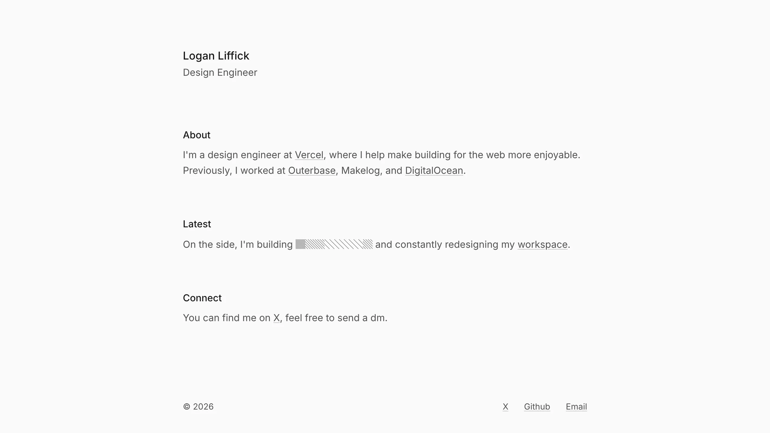 text-lg font-medium), while body text remains balanced with subtle underlines on links. A monospace font is used specifically for "hidden" or technical data points (e.g., the ASCII-style block for building updates). - Page Structure: The layout follows a linear vertical flow: Header (Name/Title) → Content Sections (About, Latest, Connect) → Utility Footer. This "standard document" flow makes it highly accessible and mobile-friendly.