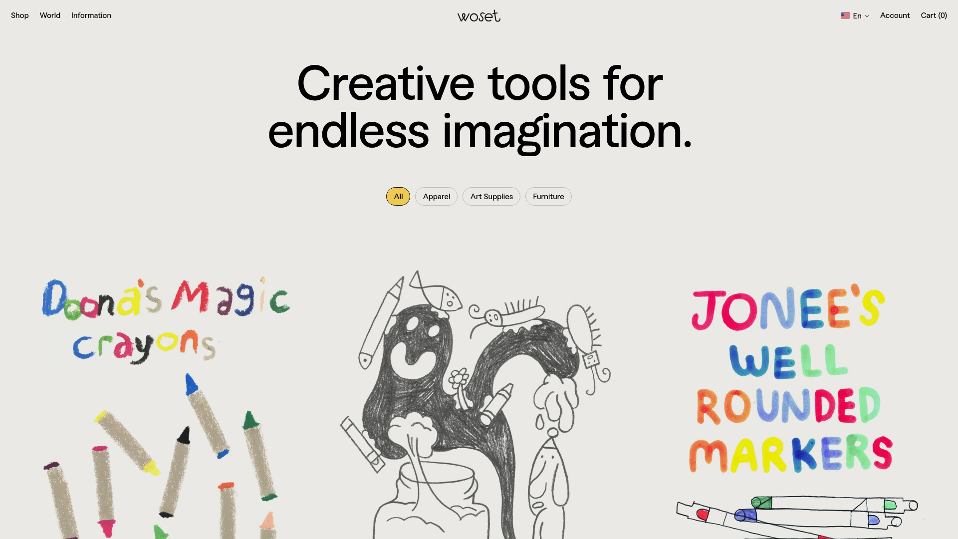 A whimsical retail layout featuring a hand-drawn aesthetic, high-contrast typography, and a unique animated product filtering system for creative brands.