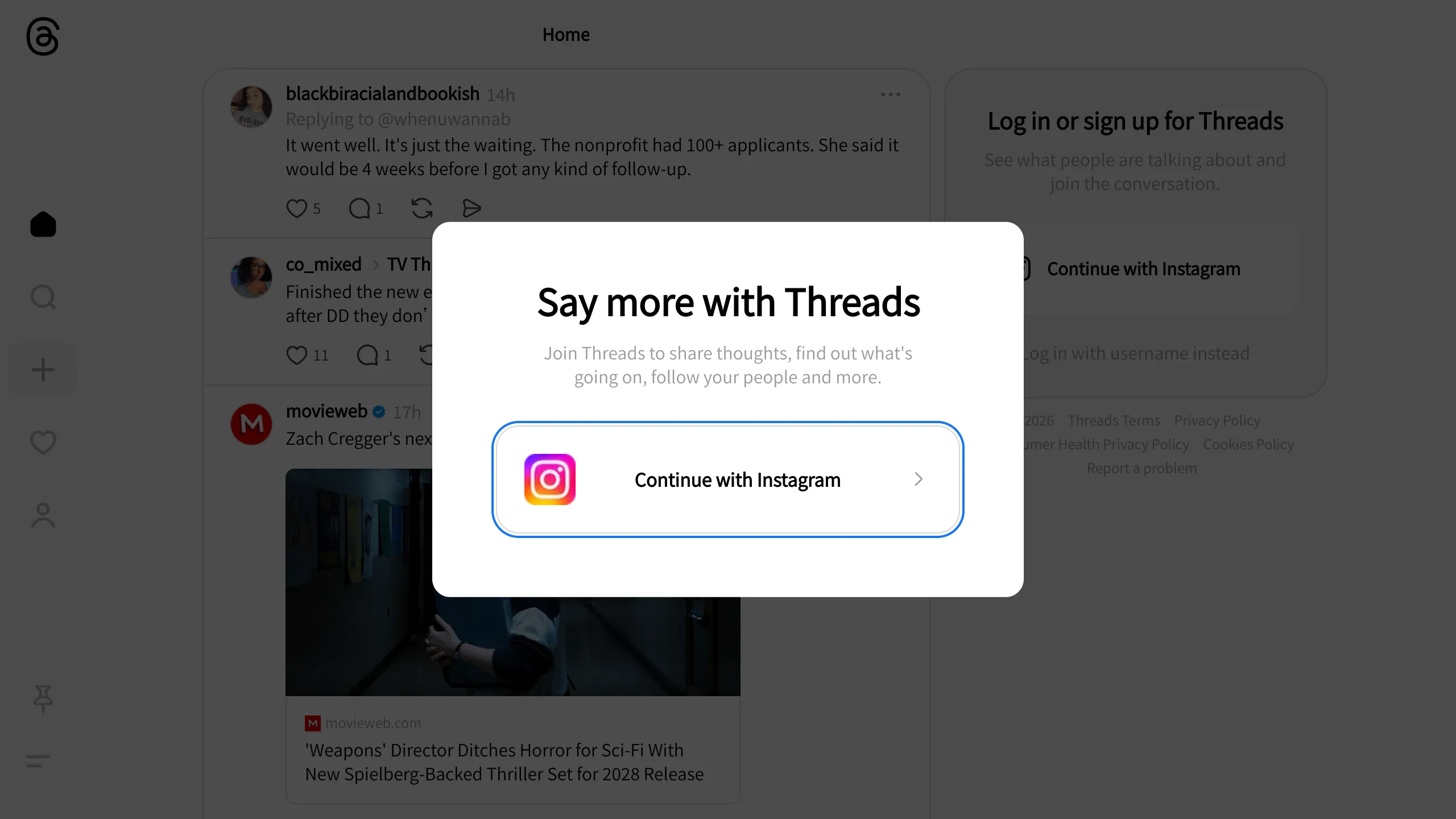 Threads is a high-density, minimalist social feed designed for real-time conversation. This interface is a strong reference for clones due to its clean typography, efficient use of whitespace, and the seamless integration of a high-priority authentication modal that overlays a blurred state of the core application without breaking the user's focus.
