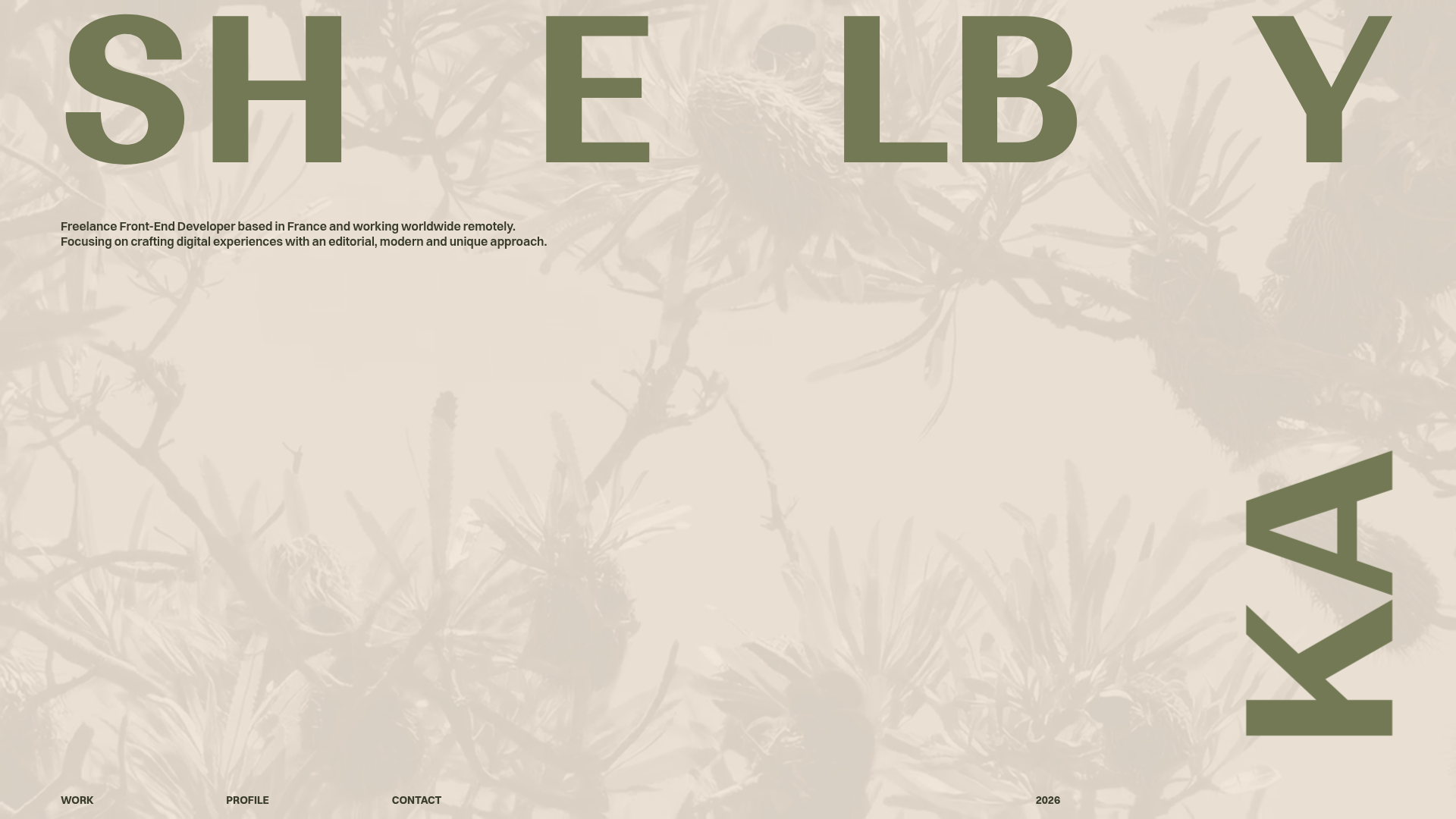 - Color Palette & Visual Hierarchy: The palette is a monochromatic, warm-neutral (beige/oatmeal) with olive-drab typography (#6d7350). The hierarchy is established through extreme scale rather than color contrast; the dominant heading creates a foreground layer while the content shifts between beige and deep charcoal (#100d16) as users scroll through different project blocks.