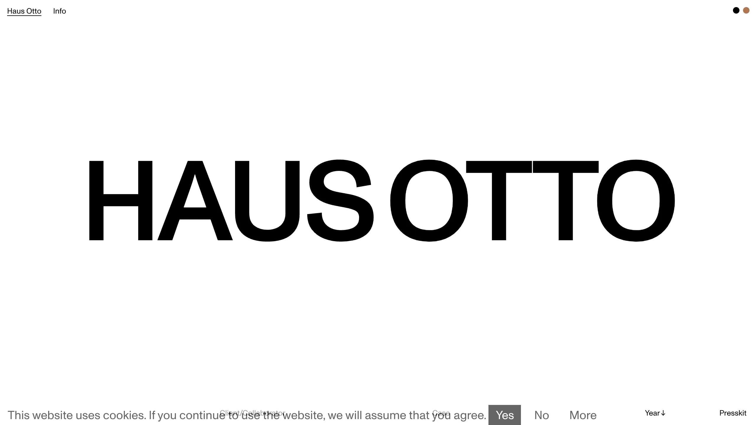 - Page Structure: The layout follows a classic 100vh hero framework. At the top, a persistent sticky navigation bar houses the brand name and 'Info' link. The center is dominated by the 'HAUS OTTO' wordmark. The bottom features a fixed utility bar containing cookie consent and organizational metadata ('Year', 'Presskit').