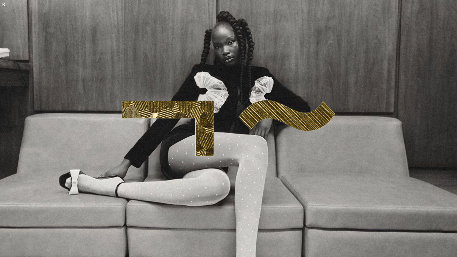 Black and white editorial layout featuring an centered hero image with abstract gold geometric overlays and a minimalist sans-serif design aesthetic.