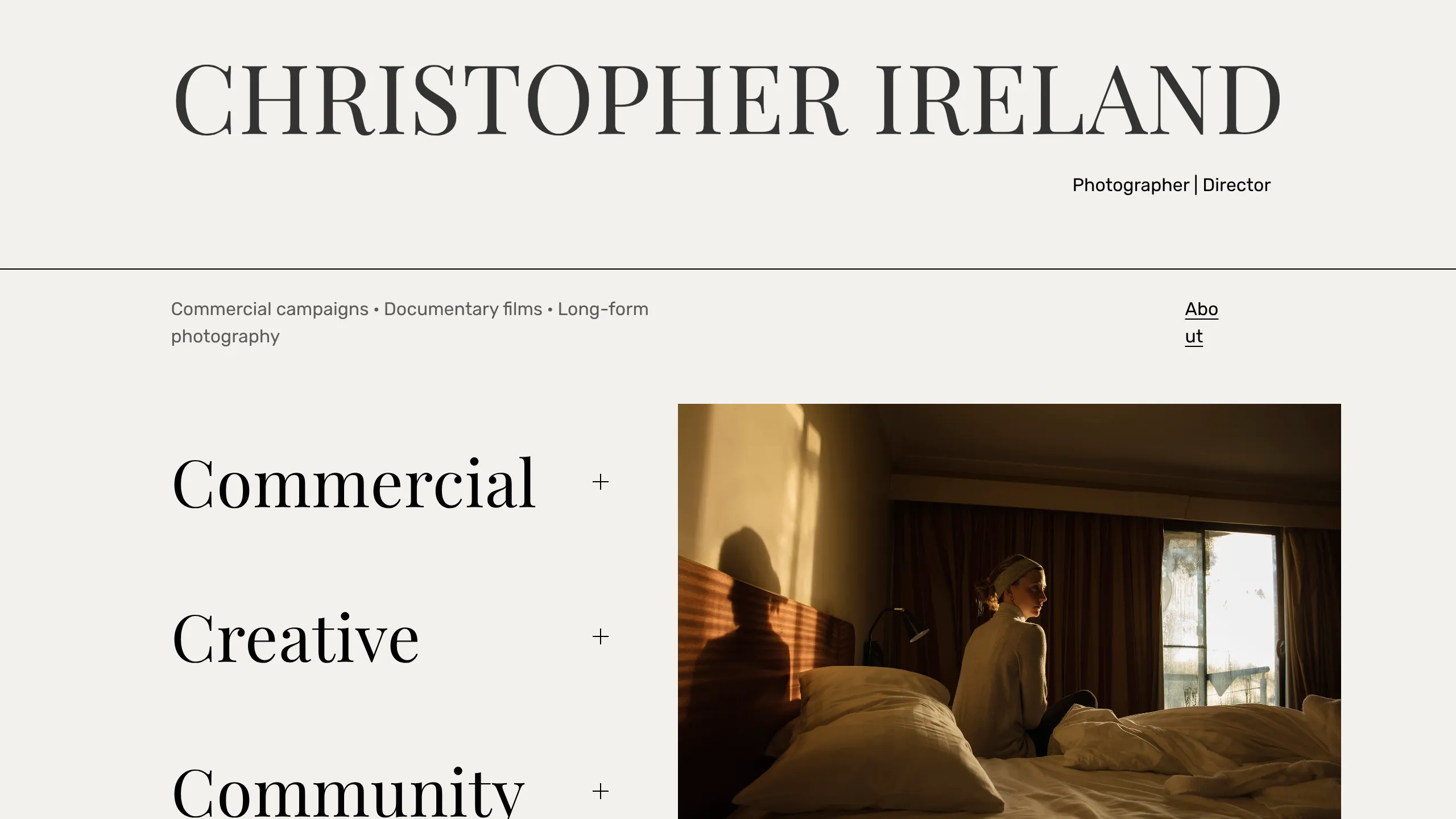This website is a minimalist professional portfolio for a photographer and director, characterized by a high-contrast serif aesthetic and a functional split-screen layout. It serves as a strong reference for creators who want to balance heavy typography with high-impact visual media without cluttering the user interface.