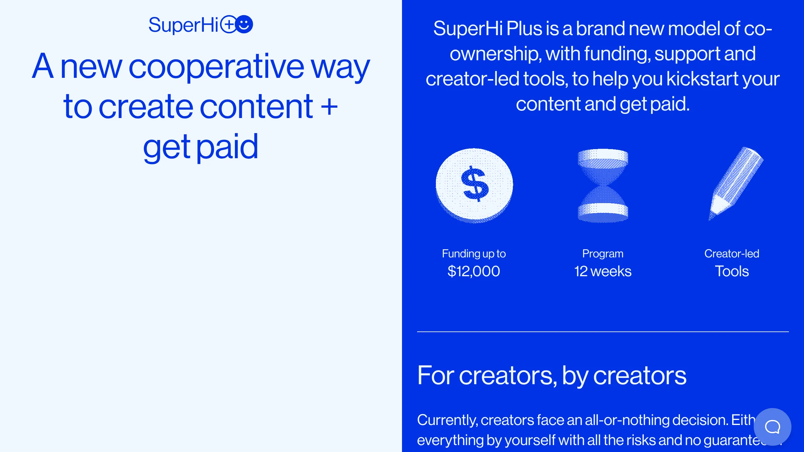This is a high-impact landing page for the SuperHi Plus accelerator, utilizing a bold split-screen layout that balances minimalist white space with vibrant, electric blue brand colors. It is a prime reference for builders looking to implement asymmetrical scroll behaviors and 3D web graphics to convey modern, technical, or creative services.