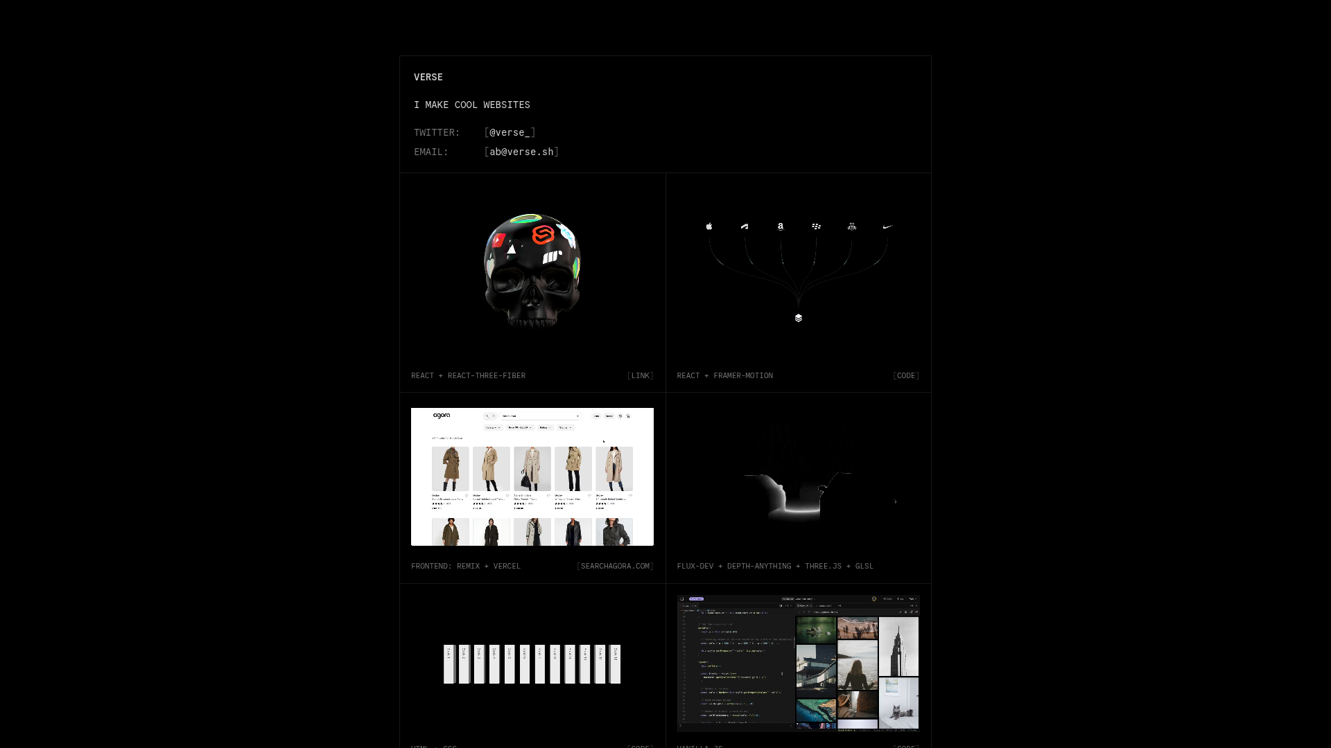 Verse Portfolio is a minimalist, dark-mode landing page designed to showcase high-end creative development and technical projects. Its strength as a remix reference lies in its use of a structured CSS grid and monospaced typography to create a "terminal-chic" aesthetic that highlights visual assets (3D models, UI shots) without visual clutter.