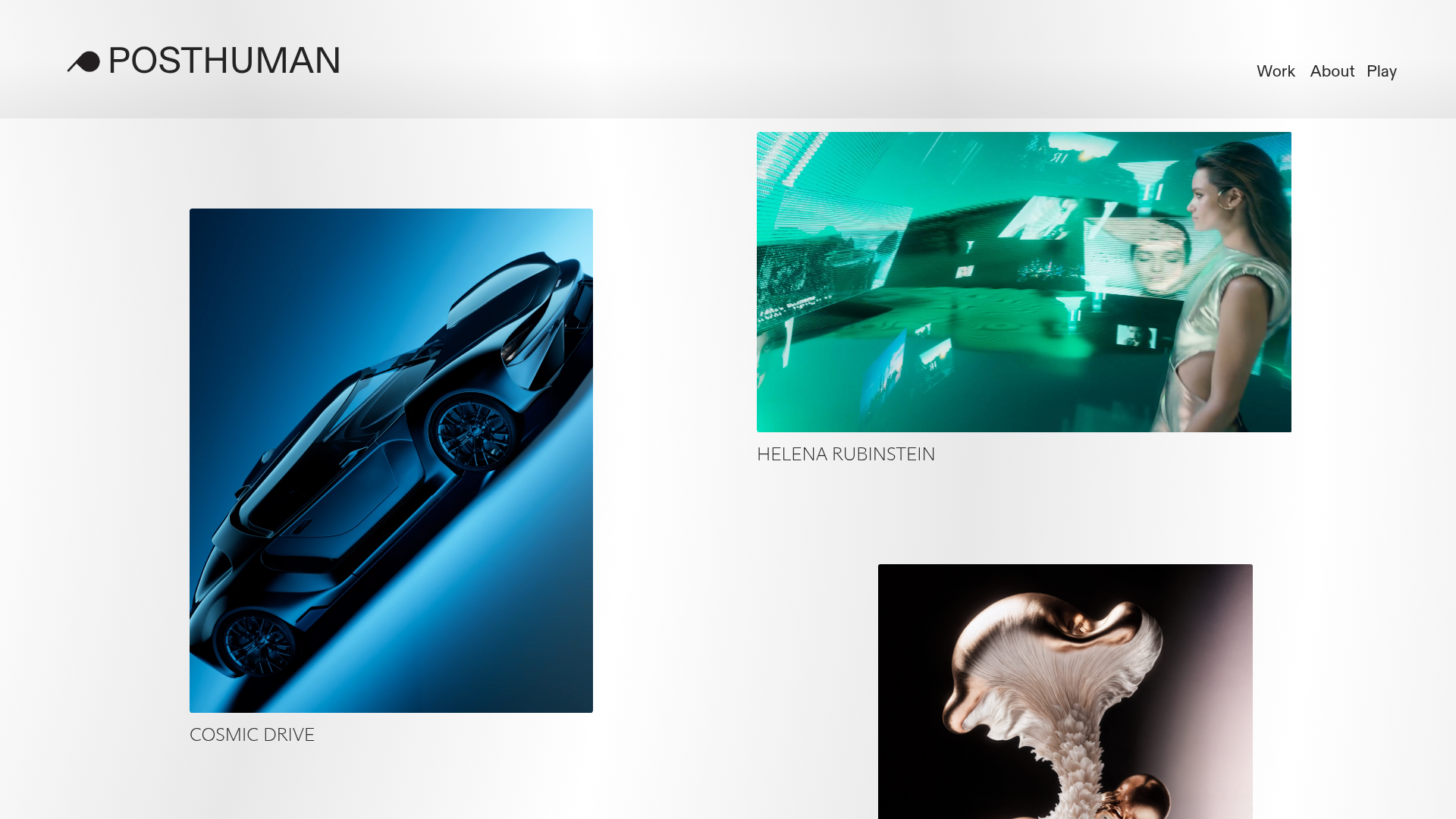 Posthuman Studio Portfolio is a high-end creative showcase featuring a sophisticated freeform masonry gallery that breaks the traditional grid. It serves as an excellent clone reference for its seamless integration of auto-playing video thumbnails and a minimal, sticky navigation system that remains secondary to the visual content.