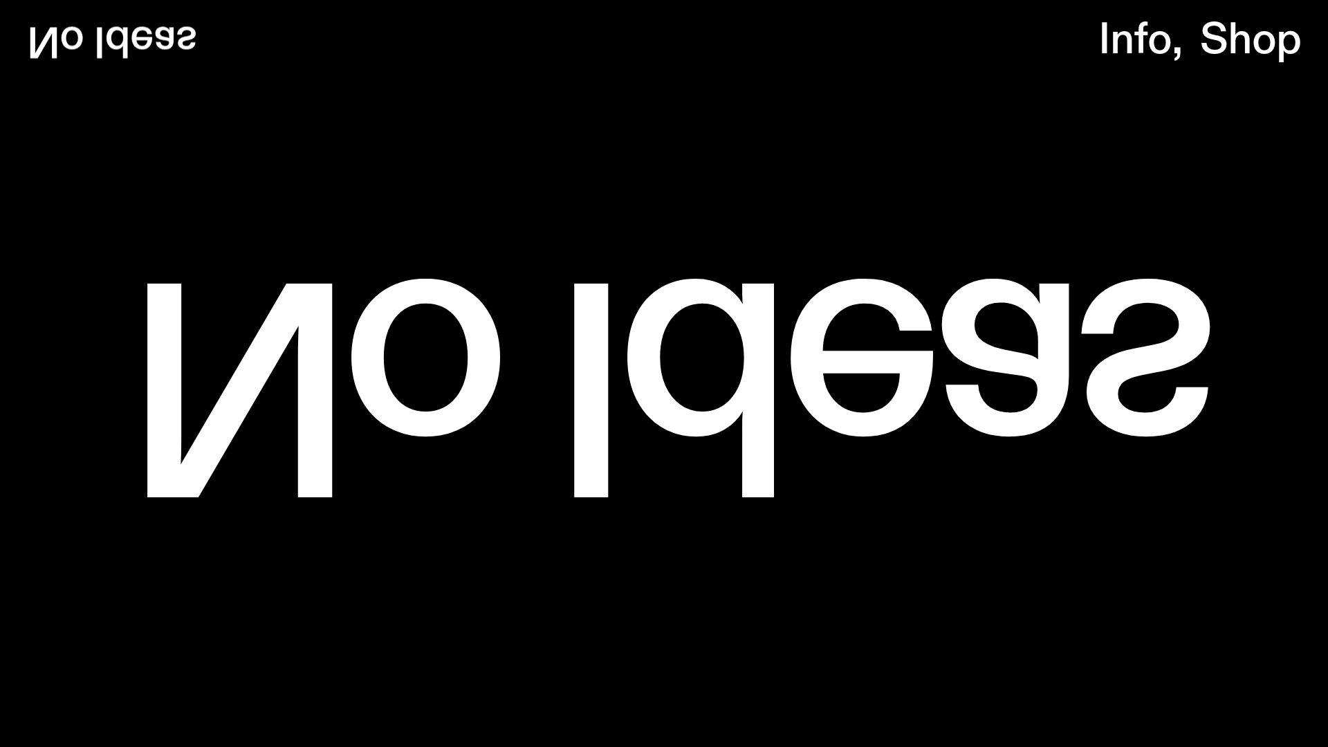 - Typography: The system relies on a bold, sans-serif Grotesk typeface. The hero features a massive, inverted/flipped 'No Ideas' wordmark that creates immediate brand recognition. Navigation links ('Info', 'Shop') and project captions use a consistent scale (