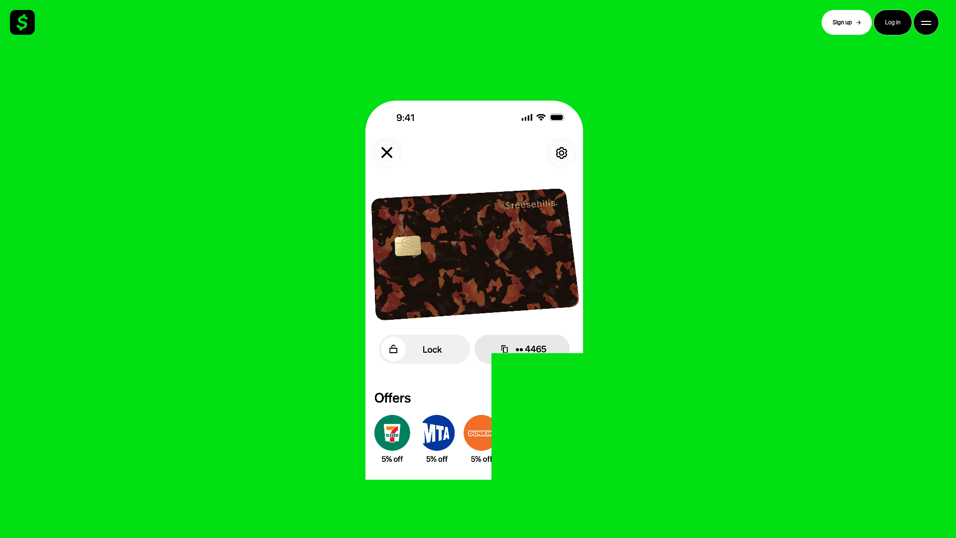 - Color Palette & Visual Hierarchy: The primary brand color is a high-saturation "Cash App Green" (HEX #00D632 or similar), providing an intense backdrop for the white device mockup. The hierarchy is driven by the device's central placement, with secondary navigation elements (Sign up, Log in, Menu) pushed to the corners to minimize distraction.