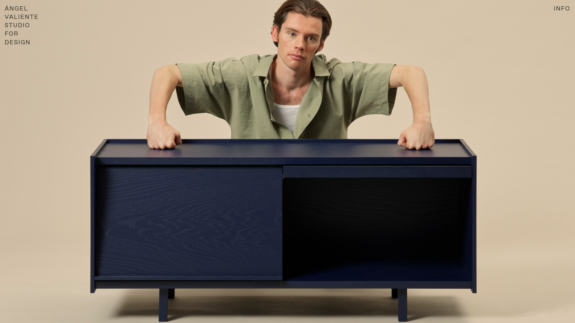 #E6DCC9) which allows high-contrast product photography—like the deep blue sideboard in the hero—to pop. The hierarchy is extremely flat; text is secondary to the object. - Typography System: A clean, all-caps sans-serif (resembling Helvetica or similar grotesque faces) is used for all navigation and headers. It utilizes a mono-spaced aesthetic for metadata (e.g., 'INFO' and 'STUDIO FOR DESIGN') to reinforce the industrial theme.