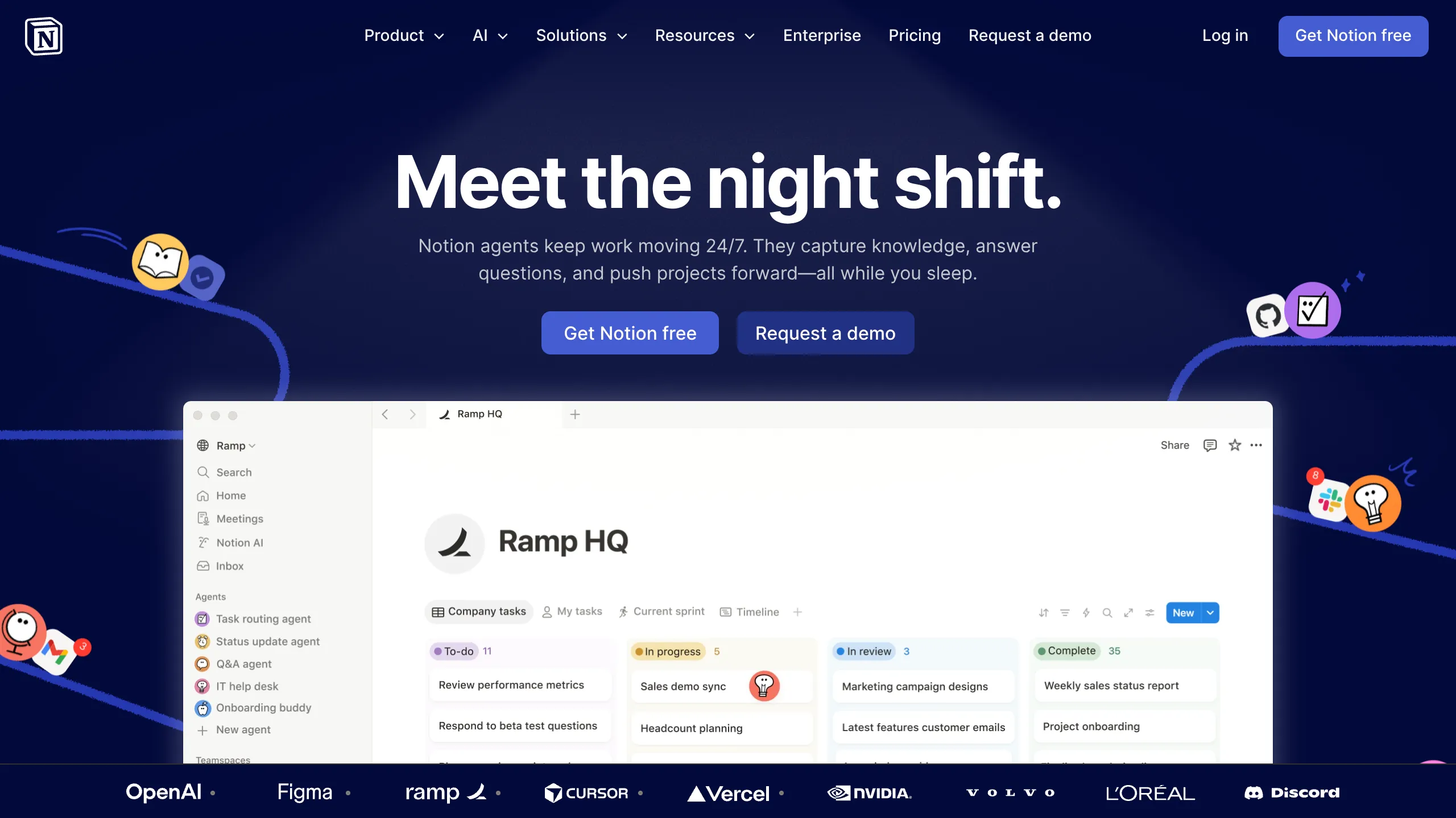 - Logo Marquee: A horizontal scrolling strip at the footer featuring monochrome partner logos (OpenAI, Figma, Vercel, etc.).