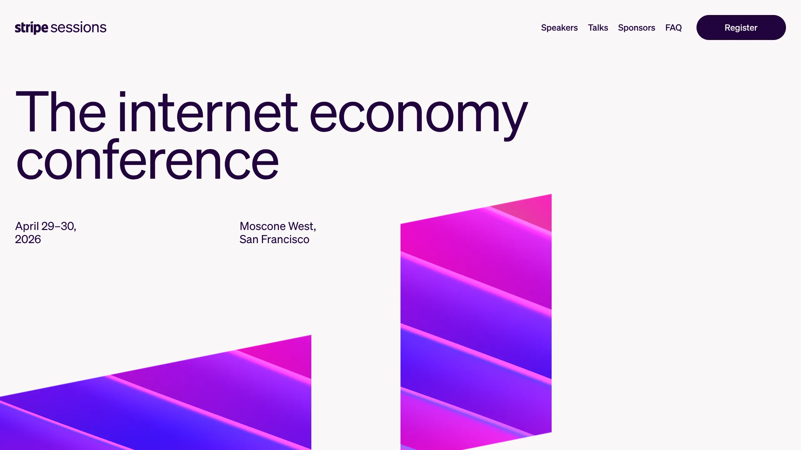 This landing page for Stripe Sessions is a masterclass in high-end tech conference branding, balancing extreme minimalism with vibrant isometric 3D visuals. It serves as a strong clone reference for developers who need to present complex information through a clean, authoritative interface that relies on sophisticated typography and spatial layout.