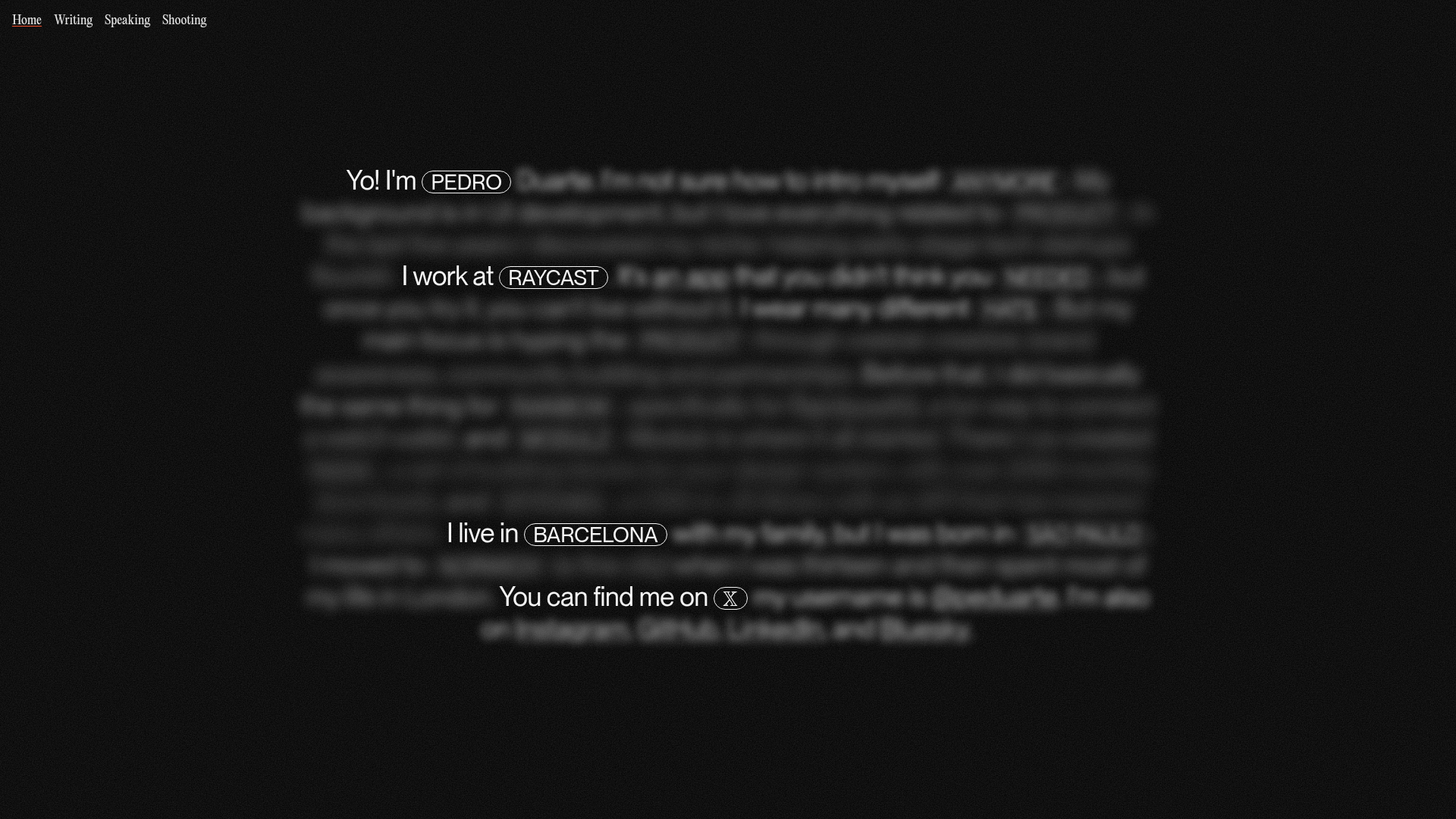 This minimalist personal portfolio serves as a masterclass in progressive disclosure, utilizing a "reveal" mechanic that expands blurred text into a detailed narrative upon interaction. It is a strong clone reference for developers who want to balance high-impact visual storytelling with a clean, low-clutter interface. The design successfully integrates full-screen video backgrounds with high-contrast typography and Radix UI components for an atmospheric, premium feel.