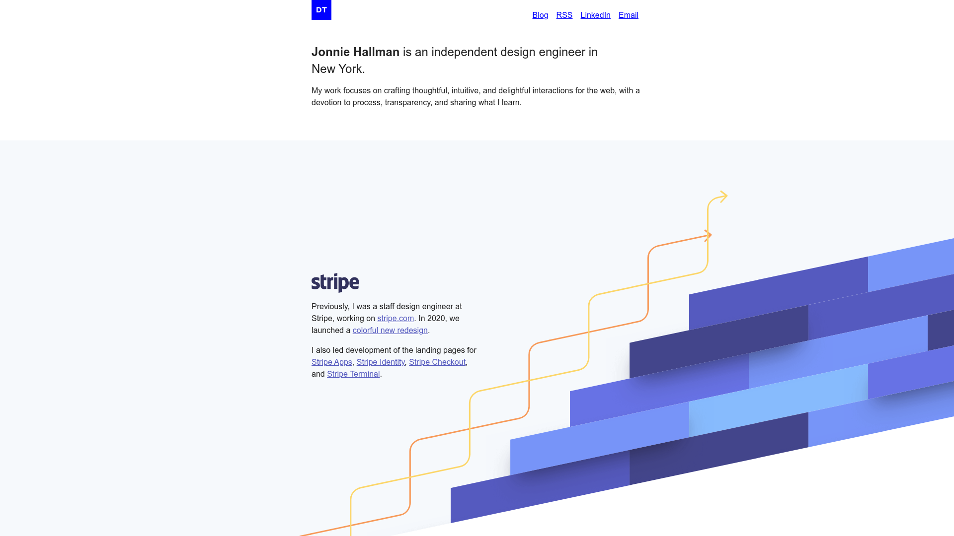 --accent-color). Each section adopts the brand identity of the client (Stripe blue, FiftyThree orange, Dropbox blue) against a neutral white or light grey base. This creates a clear visual pivot between projects. - Typography: The system relies on a clean, sans-serif stack with high-impact bold headings using