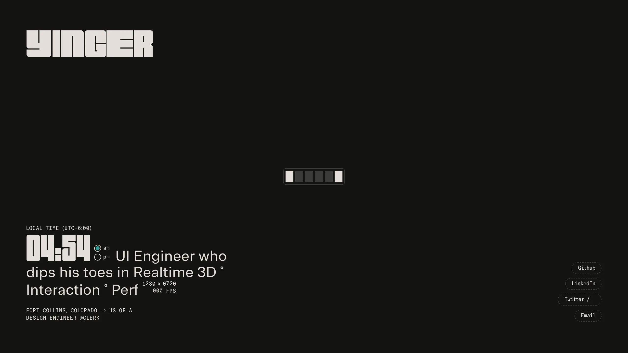 - Typography: The system relies on a mix of a bold, blocky display font for the header and wordmark ("YINGER", "04:55") and a tabular-spaced, monospace font for metadata and body copy. This ensures alignment in the real-time updating numbers for time and FPS.