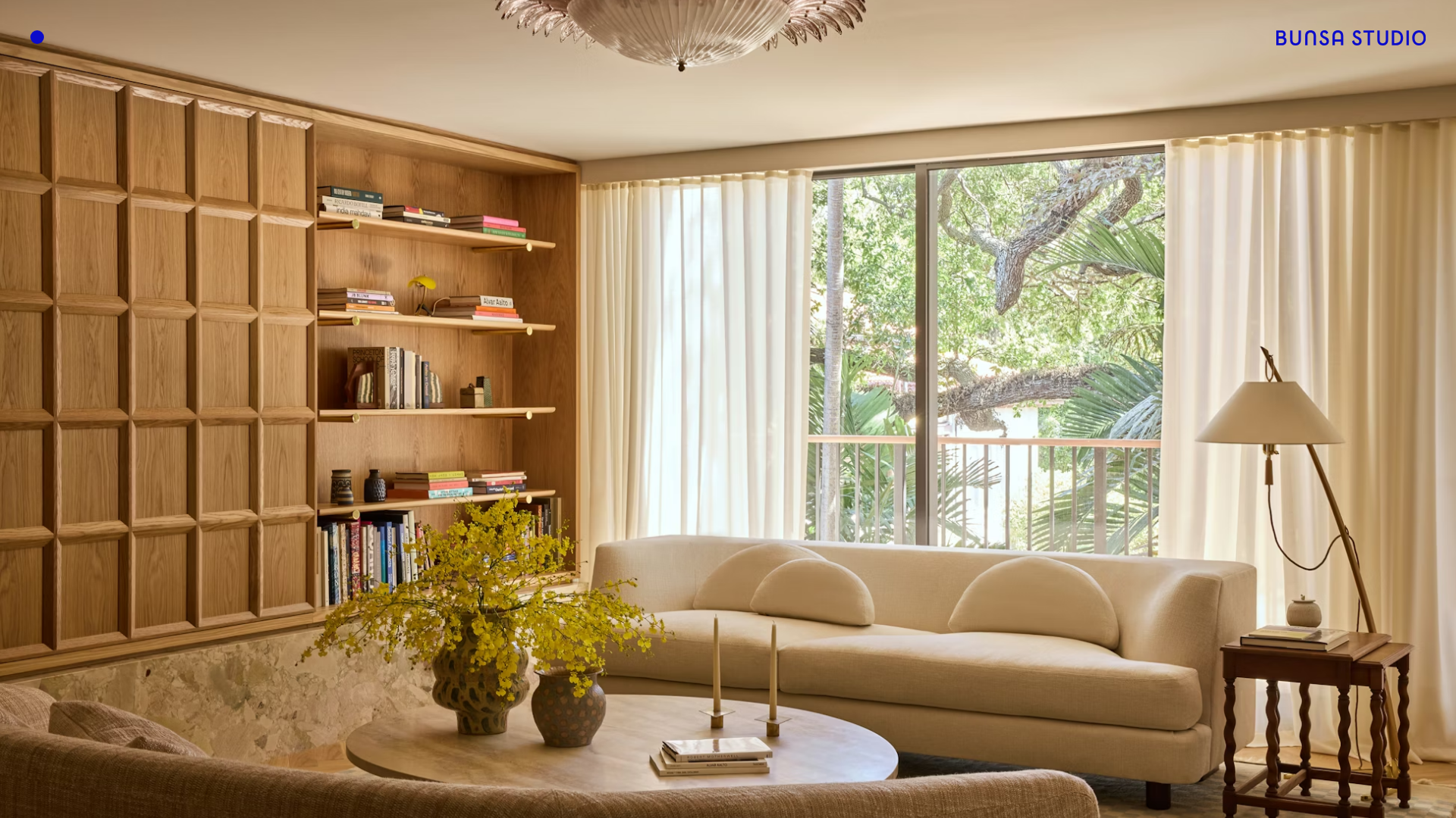 - Typography: The design utilizes a clean, modern sans-serif (likely a custom branding font or system-level modern sans) for the "BUNSA STUDIO" logo and project labels. Text is used sparingly, primarily in the top corners to maintain a clutter-free aesthetic.