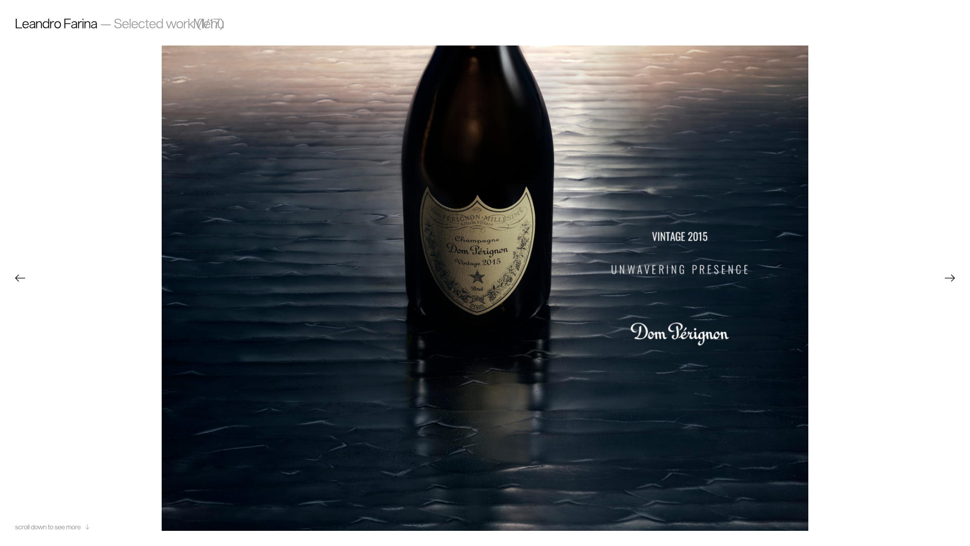 - Typography: A mix of a clean, lightweight Sans-Serif for navigation/metadata and a distinctive Serif (seen in the Dom Pérignon overlay and captions) for brand character. Titles and categories use small caps and underlined spans for subtle emphasis.