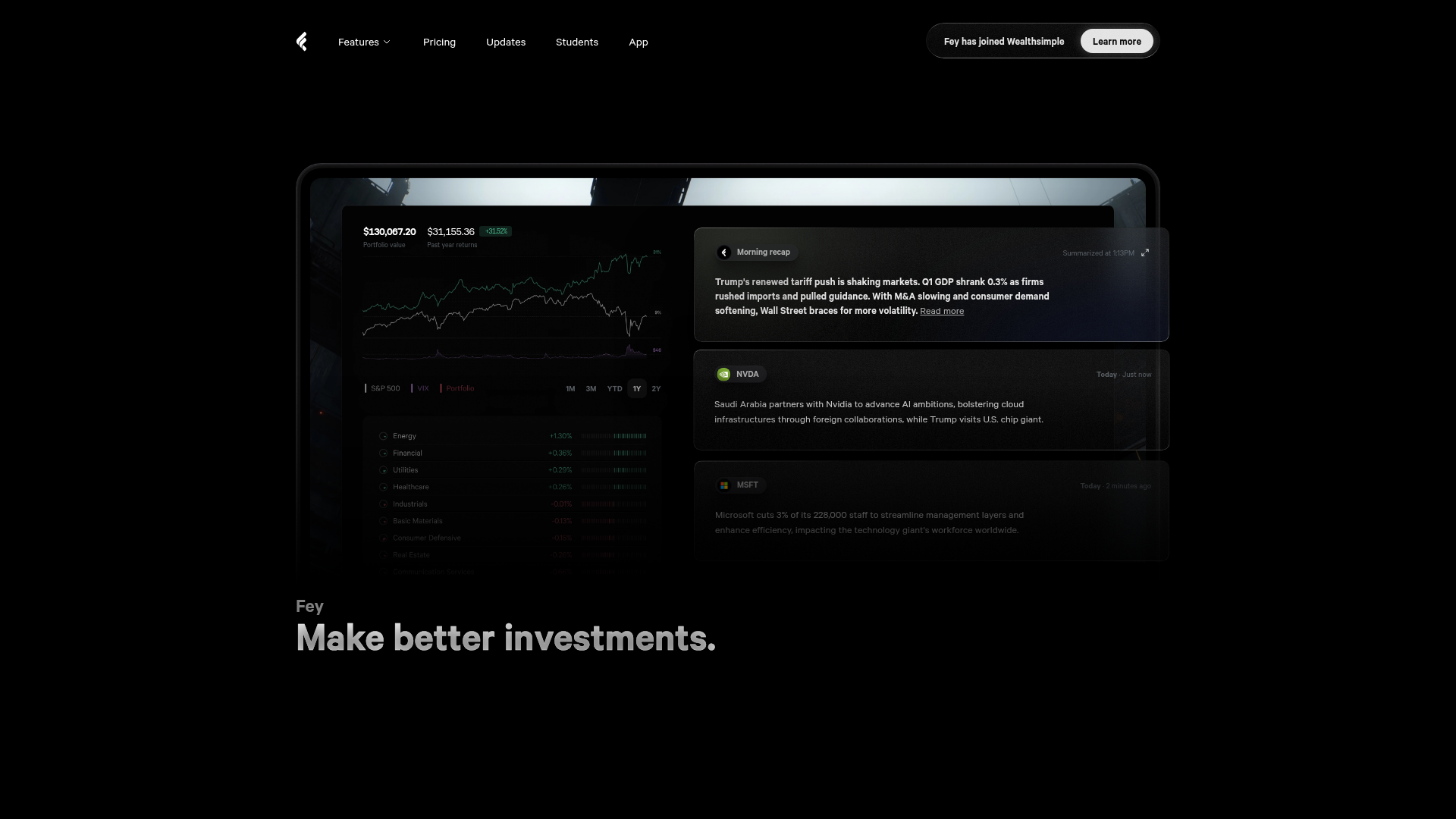 Fey is a sophisticated financial dashboard landing page that blends high-end aesthetic with data-dense utility. It serves as an excellent reference for builders because it demonstrates how to present complex financial information through a minimalist, dark-mode 'glassmorphic' interface that prioritization clarity and motion.