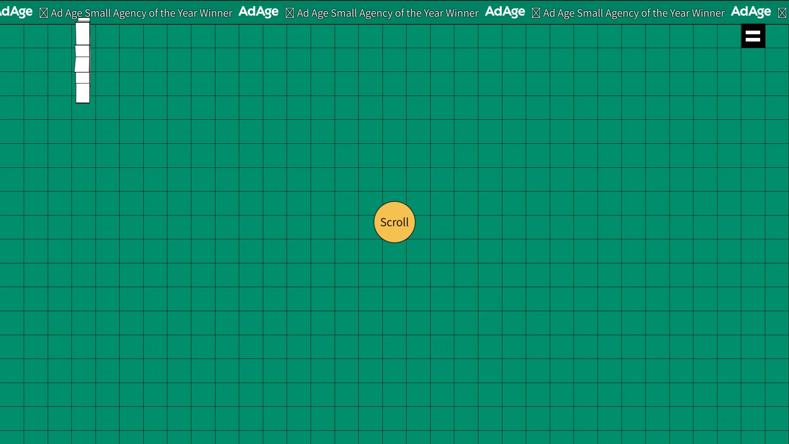 - Animated Marquee: A continuous horizontal news-ticker style announcement bar ("Ad Age Small Agency of the Year").