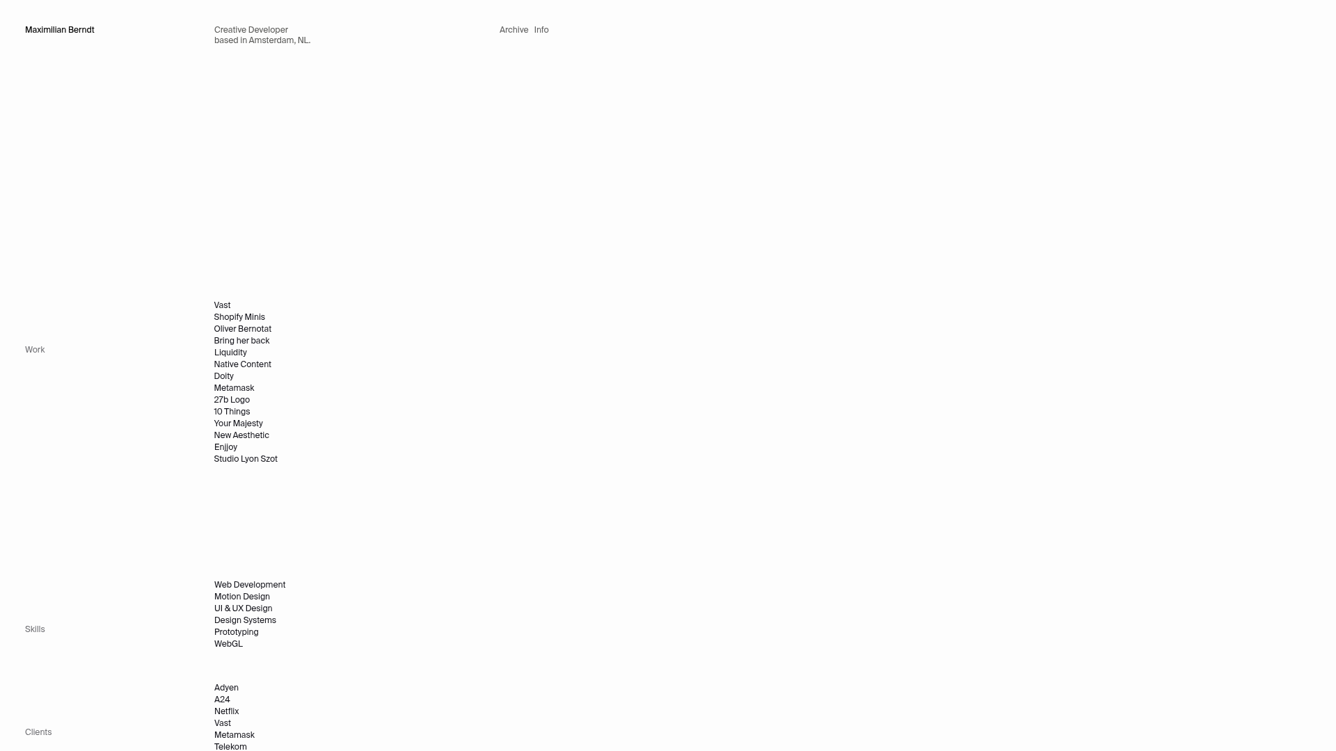 Maximilian Berndt's portfolio is a masterclass in minimalist "brutalist-light" web design, utilizing a stark white canvas and a precise grid system. It is a strong clone reference for its sophisticated use of CSS sticky positioning and hover-triggered micro-interactions that create a sense of depth and activity without visual clutter.
