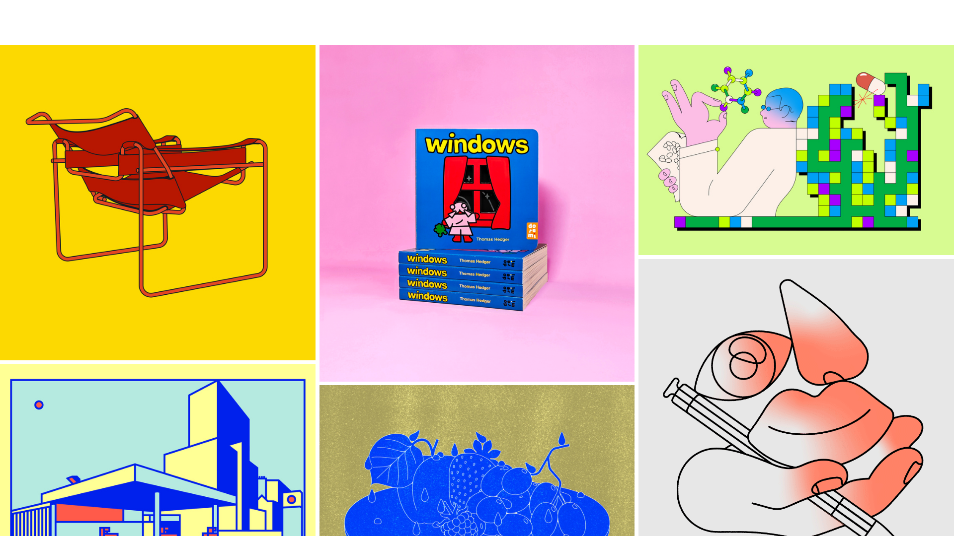- Color Palette & Visual Hierarchy: The UI uses a strictly neutral baseline (likely white or light gray background) to let the vibrant colors of the illustrations define the page's energy. Hierarchy is flat; there are no text labels or headers on the main grid, making each image a primary entry point.