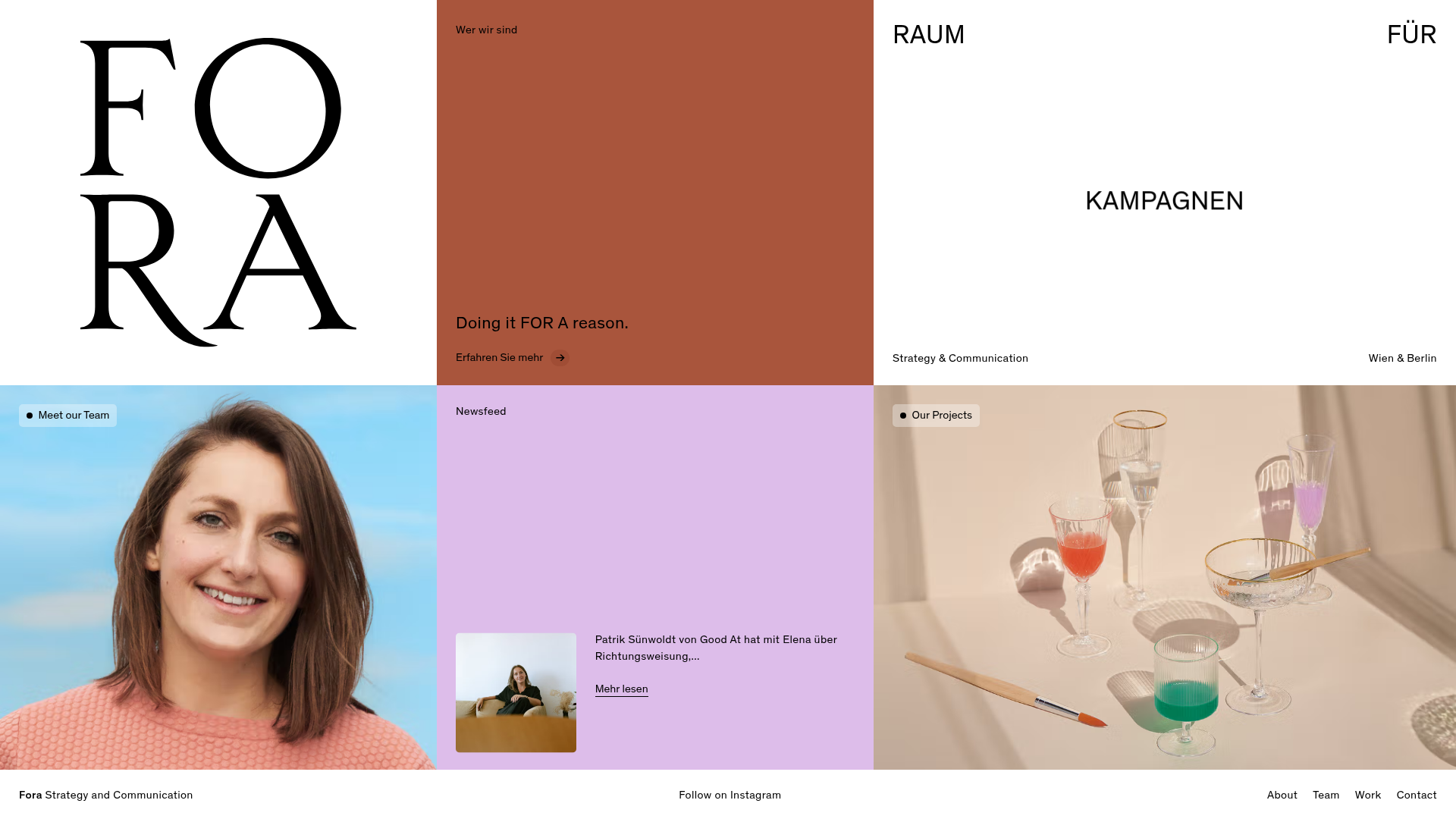 - Typography: A dual-system approach featuring a large, elegant high-contrast Serif for the logo (FORA) and large headings, paired with a clean, functional Sans-Serif for body text and micro-copy. Text is often used as a graphic element, such as the vertical and architectural alignment of "RAUM FÜR KAMPAGNEN."